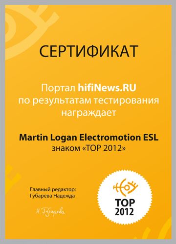 По результатам тестирования портал hifiNews.RU награждает Martin Logan Electromotion ESL знаком "TOP 2012".