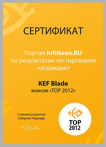 По результатам тестирования портал hifiNews.RU награждает KEF Blade знаком "TOP 2012".