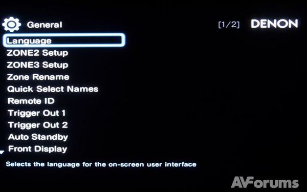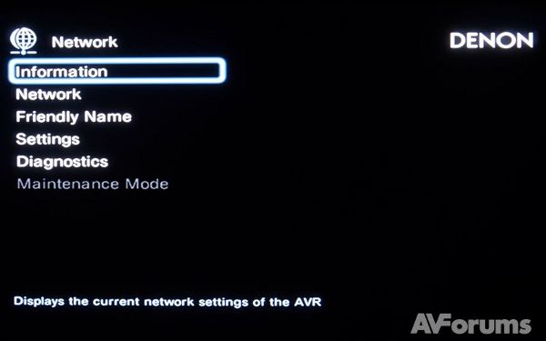 Раздел Сеть включает в себя информацию о сети, установку функции включения или отключения сети в режиме ожидания, изменение имени ресивера в вашей домашней сети, выбор настроек для проводной локальной сети (LAN), режимы обслуживания и диагностики для использования службой сервиса или пользователем. Наконец, Общий раздел меню позволяет выбирать язык, создать вторую зону прослушивания, переименовать вторую зону. Есть возможность создания имен быстрого выбора, настройка 12 В выхода для запуска внешних устройств, установка автоматического режима ожидания, настройка яркости встроенного дисплея (есть для этого и кнопки на передней панели). Можно просмотреть информацию о настройках ресивера, установить проверку обновления прошивки, обновить программное обеспечение, отображение уведомлений об обновлении и модернизации, а также заблокировать настройки для предотвращения случайных изменений.