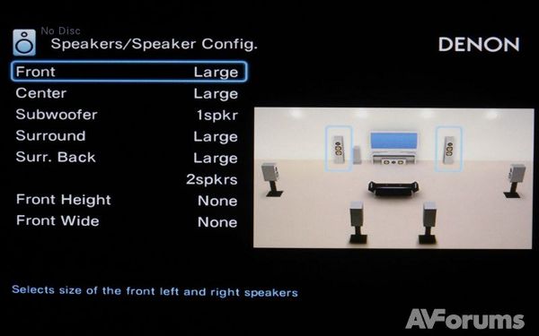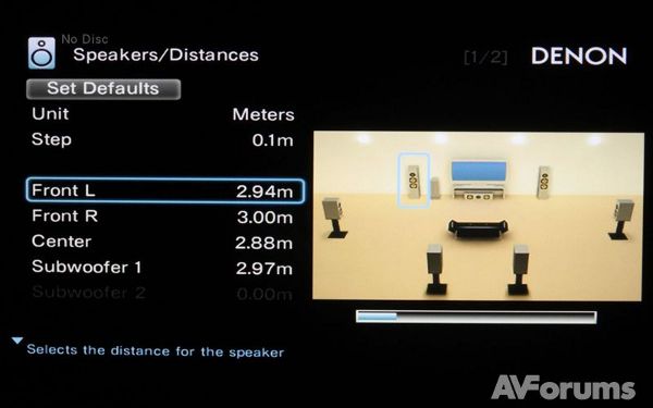 В разделе Колонки есть несколько экранов для различных аспектов настройки акустических систем. Хотя эти настройки выполняются автоматически через систему Audyssey, вы можете настроить их и вручную или откорректировать, если в этом есть необходимость. Главный экран позволяет конфигурировать громкоговорители, выбрать сабвуфер, установить расстояния и уровни, выбрать частоту раздела кроссовера от 40 Гц до 240 Гц и выбрать используемые передние колонки. Меню конфигурации громкоговорителей позволяет вводить расположение и тип колонок в вашей системе. Второй экран определяет расстояние в метрах от громкоговорителей до основной точки прослушивания, в то время как последний экран использует тестовые сигналы для настройки уровня громкости каждого громкоговорителя относительно основного места слушателя. Если вы собираетесь делать это вручную, то нужен будет измеритель уровня звукового давления.