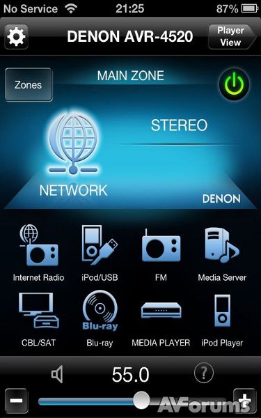 Denon предлагает удаленное приложение для использования с устройствами на базе iOS или Android, которое позволяет легко выбирать входные источники, контент из сети, управлять зонами прослушивания и многое другое. Приложение бесплатное, и мы нашли обе версии, весьма эффективными. Интерфейс хорошо продуман и приложение обеспечивает управление основными функциями AVR-4520, такими как включение / выключение, громкость, выбор входов и режима пространственного звучания. Есть восемь настраиваемых домашних экранов, что позволит по собственному усмотрению настраивать внешний вид и функциональность удаленного приложения Denon. Есть также страница управления по зонам звучания, которая позволяет с одного экрана выбирать вход, регулировать уровень звука для всех зон. Вы можете прослушивать радиостанции из интернета, включая ранее избранные, а также получить доступ с просмотром в виде миниатюр к вашей цифровой медиа-библиотеке, с поиском в библиотеке и списках воспроизведения. Из представленных в последнее время, конечно, это одно из лучших приложений удаленного управления для ресиверов.