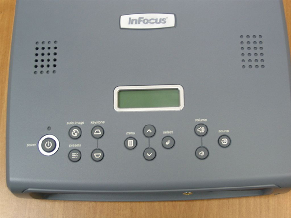 Управление. Пульт самый маленький в линейке проекторов InFocus, но повторяет черты семейства. Наиболее часто использующиеся кнопки Меню, Выбрать и Вверх, Вниз, расположены ромбом внизу, что при таком малом размере пульта несколько неудобно. Присутствуют кнопки выбора видео или компьютерного сигнала, Бланк (отчет о состоянии проектора) и кнопка Эффект.