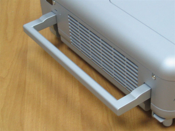 Дизайн. Серый прямоугольный корпус, средней величины, со сглаженными краями и ручкой для переноса. Тяжелый – почти 6 кг. На передней панели – решетка радиатора лампы.