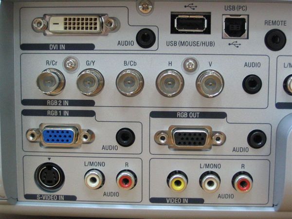 Форматы и коннекты. Проектор принимает, пожалуй, все сигналы цветности, имеющиеся на планете Земля. В наличии – коннекты и на все типы видео- и компьютерных сигналов. RGB предусмотрен в виде D-sub, есть также DVI: D, S-video, RCA, – и даже 2 слота для PCMCI-кард, управление RS 232. Легко проходит взаимодействие проектора с компьютером – он автоматически подстраивается под разрешение компьютерного сигнала. Как результат: высокая чёткость текстовых файлов. К слову, управление проектором через компьютер также легко и удобно – оно возможно через USB, всего которых 3 штуки портов, в том числе и для презентаций слайд-шоу с флэш-накопителя.