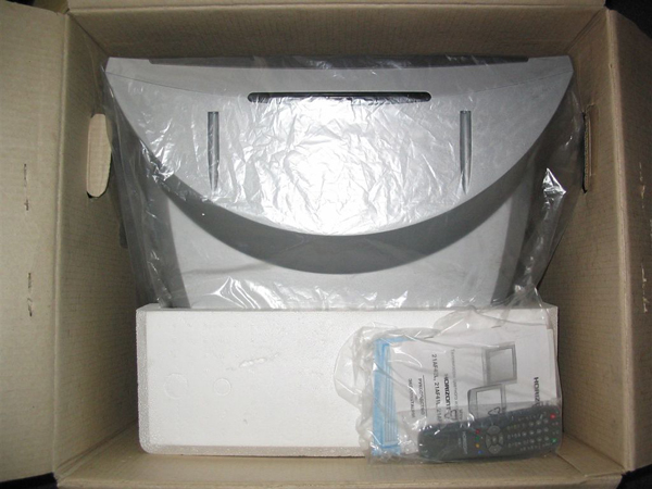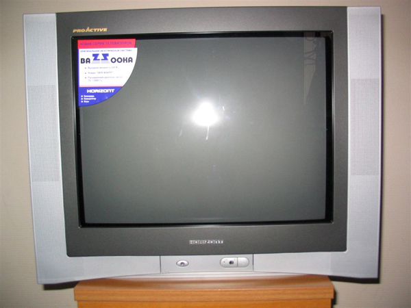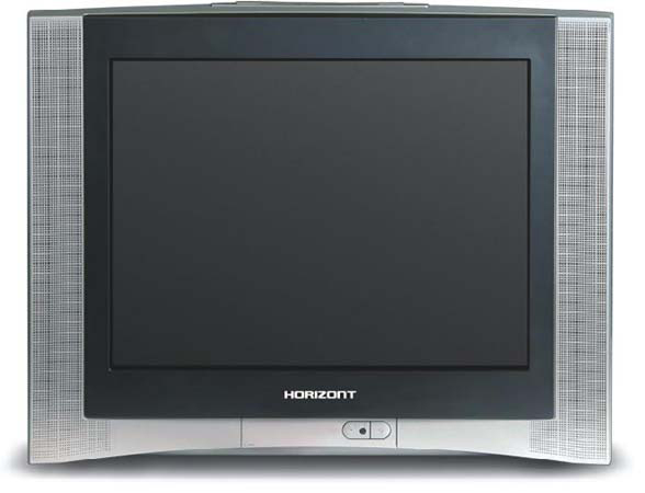 Дизайн. В своей традиционной телевизионно-прямоугольной форме «HORIZONT» в этой модели превзошел сам себя. Передняя панель с плоским экраном, за счет слегка скошенных вовнутрь решеток колонок, стал выглядеть уже даже не плоской, а вогнутой. А вот кинескоп действительно абсолютно плоский. Отделка корпуса радует чистотой и тщательностью исполнения, кнопка «Питание» которая выглядывает через крышечку с панелью разъемов, задумана логично, и изготовлена качественно. Пульт большой с утончением в районе «ручки» и расширением в районе «поля кнопок», что весьма удобно для пользователя.