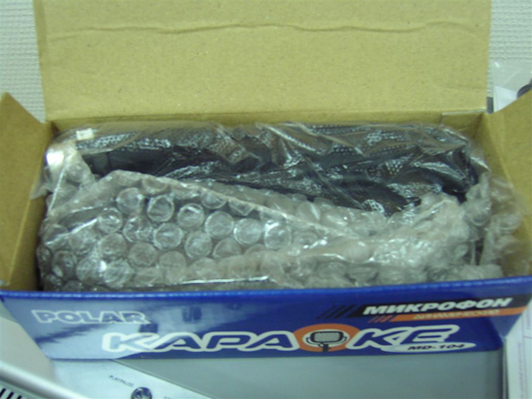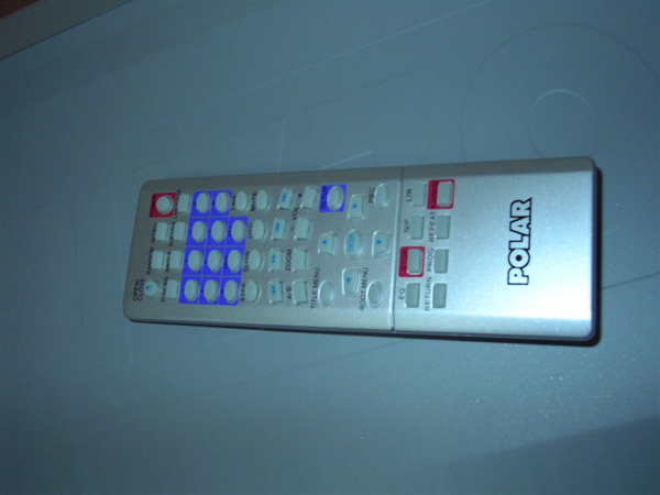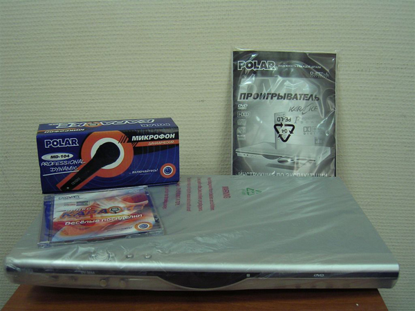 Потребительские свойства. Polar DV-3055 продаётся в красочной упаковке с ручкой для переноски. В коробке мы нашли сам плеер, пульт управления с батарейками, инструкцию, микрофон с проводом в отдельной упаковке, диск караоке и кабель. Инструкция подробная на русском языке. Качество пластика пульта ДУ оставляет желать лучшего. Но в нём тоже есть изюминки, во-первых, он просто невесомый, а во-вторых, кнопки выполнены из резины со светонакапливающими свойствами, то есть по типу фосфатов светятся в темноте. Но учить расположение кнопок придётся всё же днём, так как надписи светиться не будут. Микрофон для караоке сделан неплохо, если не считать резкого синтетического запаха от поролоновой ветрозащиты, спрятанной под металлической сеткой. В левой части проигрывателя сверху находятся четыре кнопки управления плеером (Play, Stop, Eject, Mute), очень жаль, что среди них нет клавиш перехода по трекам – их очень не хватает.
