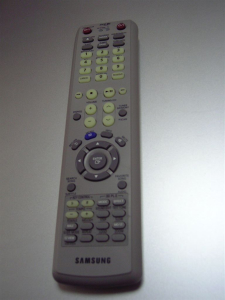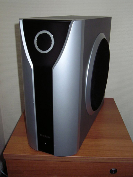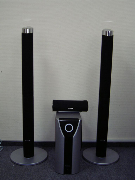 Дизайн. Комплект домашнего кинотеатра Samsung HT-TKP75 выполнен в чёрно-серых тонах. Сетки (грили), защищающие динамики, несъёмные из чёрного нейлона. Сами корпуса сателлитов из серебристого пластика. На сабвуфере есть стилизованный под фазоинвертор хромированный круг. Корпус DVD плеера серый, передняя панель чёрного цвета закрыта зеркальным пластиком, до которого лучше не дотрагиваться - отпечатки остаются. При включении на проигрывателе загораются: ярко синим цветом окантовка клавиши включения и кнопки регулировки звука, находящиеся под углом относительно друг друга. Дисплей в выключенном состоянии не найти, когда же плеер включен, на нём отображаются светлые символы. Экран удачный: информация читается легко в любое время суток.