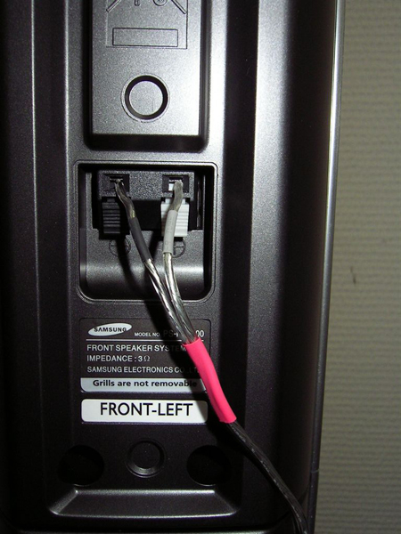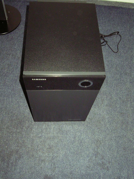 Все сателлиты выполнены из пластика, но достаточного тяжёлого, чтобы не допускать лишних резонансов внутри корпуса. Корпус сабвуфера по-взрослому выполнен из MDF и эта низкочастотная колонка имеет уже солидный вес, что говорит о серьёзности намерений озвучить потрясающими басами не только вашу, но и соседнюю квартиру. Динамик сабвуфера смотрит вниз, там же находится и порт фазоинвертора. К усилителю, встроенному в сабвуфер, подключаются все компоненты акустических систем, а DVD плеер присоединяется специальным кабелем идущем в комплекте. Мощность встроенного усилителя равна 800 ваттам (130х5 и 150 сабвуфер).