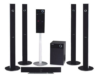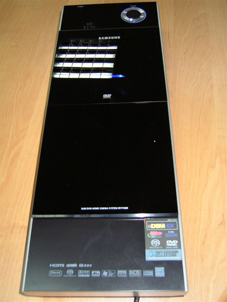 Дизайн. О дизайне домашнего кинотеатра Samsung HT-P1200 можно говорить долго, чувствуется, что этому комплекту было отдано много времени. Проигрыватель DVD устанавливается вертикально на специальной стойке. Передняя панель выполнена из чёрного стекла, привод дисков расположен по центру. Когда нажимаешь на Eject, створки открываются наподобие дверей из космических блок-бастеров. Стильно и необычно. Сверху на панели расположена ручка регулировки громкости, окантовка которой светится синим цветом. Там же находится и дисплей, на котором отображаются светлые символы. Всё красиво и информативно. Акустика окрашена в чёрные тона. На всех сателлитах, а так же сабвуфере есть изюминка – хромированная окружность, напоминающая ручку громкости.